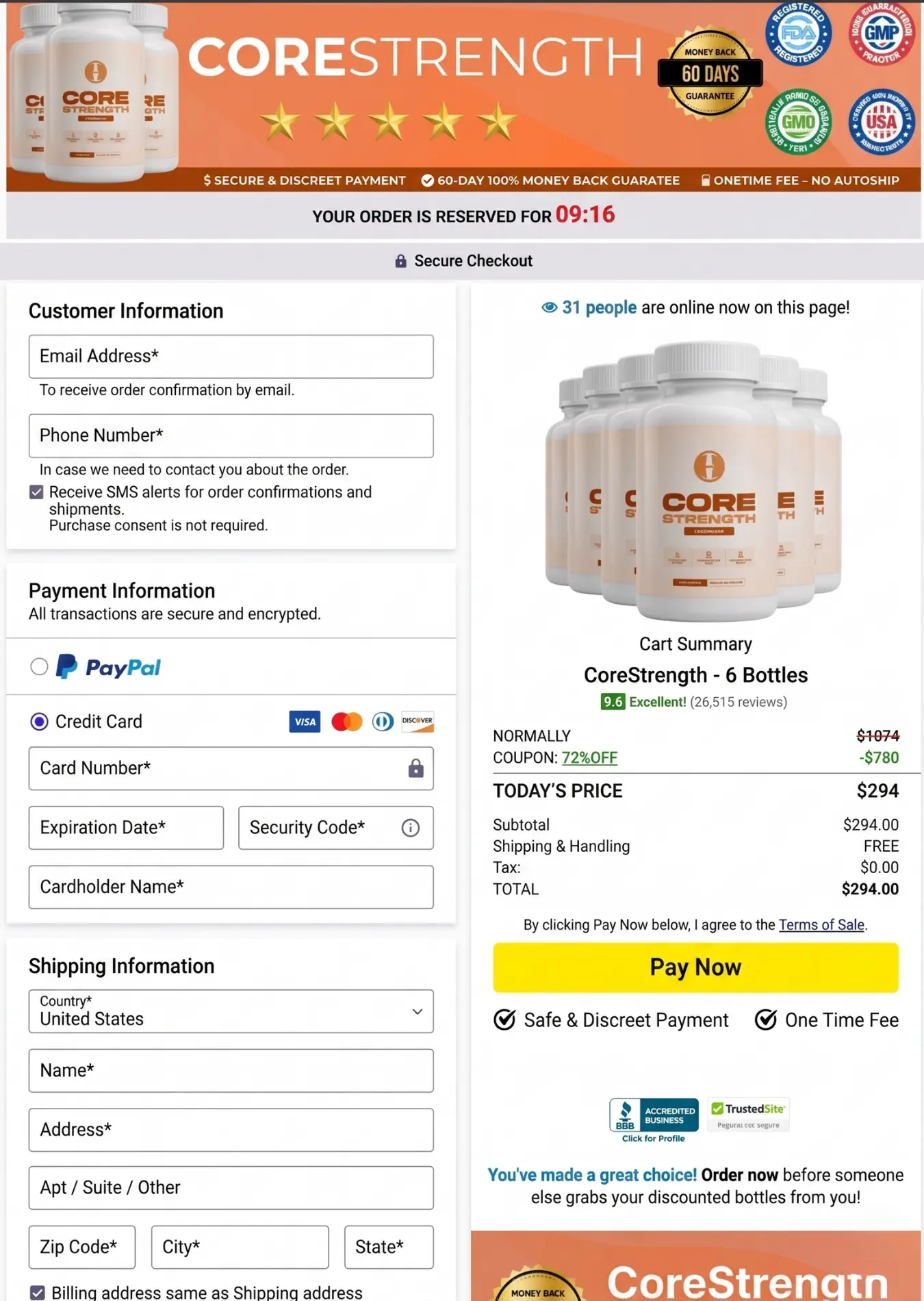 Once you click the “Buy Now” button directly below this text, you will be securely redirected to the encrypted checkout page. Simply enter your shipping details, and your CoreStrength package will be immediately processed for rapid US dispatch, ensuring your joint-restoring formula arrives at your door as quickly as possible.